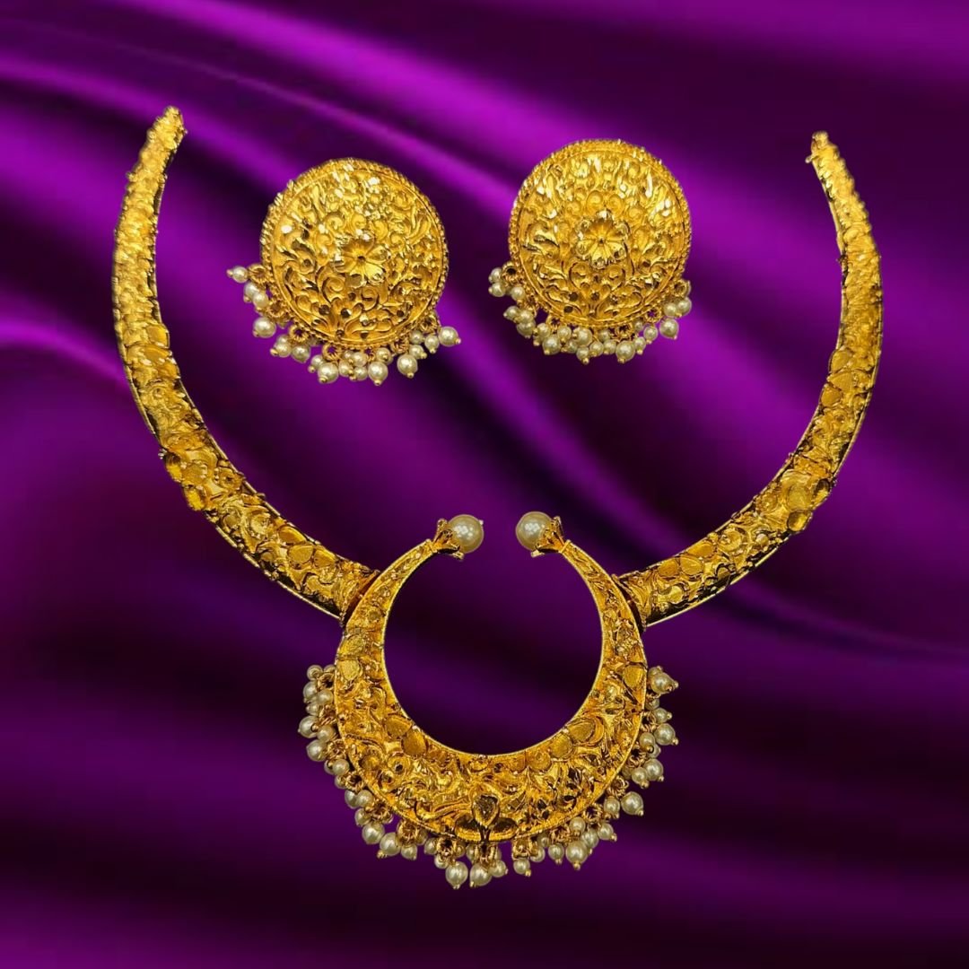 Exclusive A Sirkar replica with dimond frosting work with pearl work kanbala motif hasuli necklace
