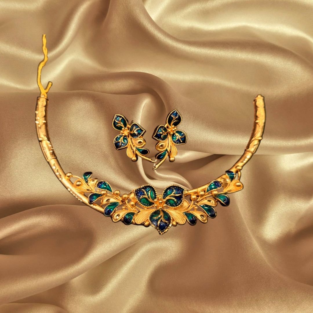 Discover Exclusive Parashmani Jewellers replica with diamond frosting, floral and leaf motif meenakari hasuli necklace with earrings set for women & girls. Enjoy 5% off and discounts on every product. Visit Sodepur Madhyamgram’s best gold-plated jewellers in Kolkata.