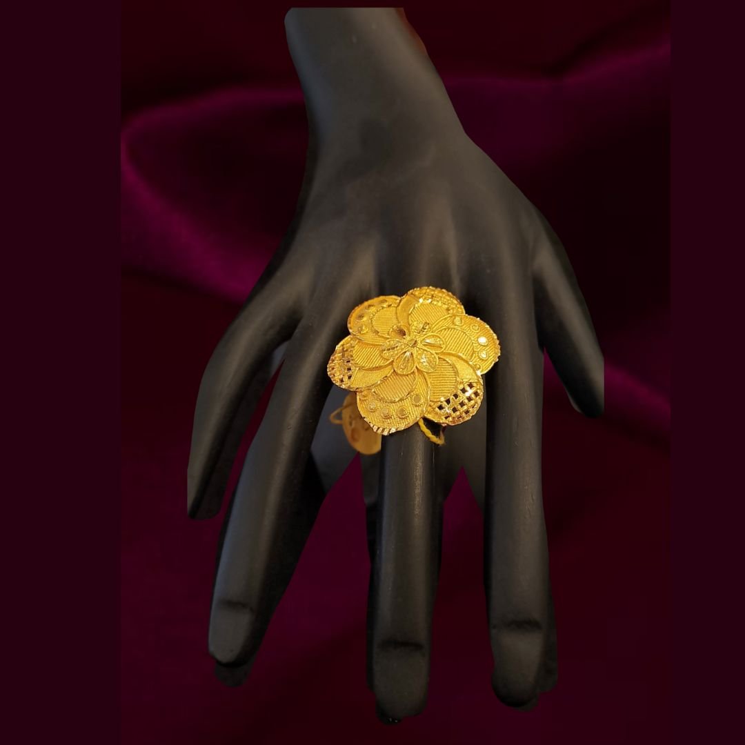 Introducing a stunning traditional gold replica finger ring with intricate diamond frosting work and a large floral motif. Made with premium materials and high-quality gold plating, this ring is perfect for any occasion. Get 5% off at Mr Jewellers, Kolkata’s top gold-plated jewellery shop.