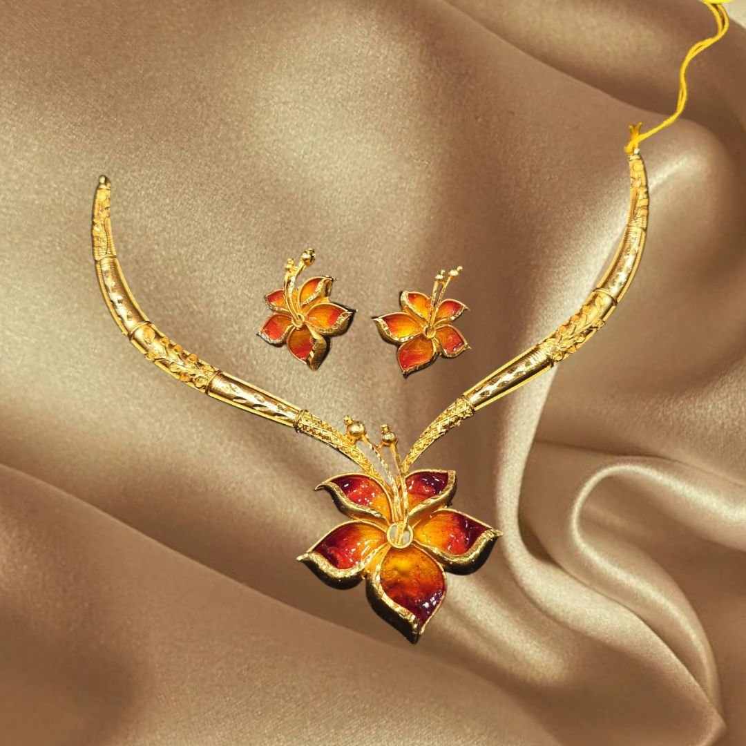 Discover Exclusive Parashmani Jewellers replica with diamond frosting, floral and leaf motif meenakari hasuli necklace with earrings set for women & girls. Enjoy 5% off and discounts on every product. Visit Sodepur Madhyamgram’s best gold-plated jewellers in Kolkata.