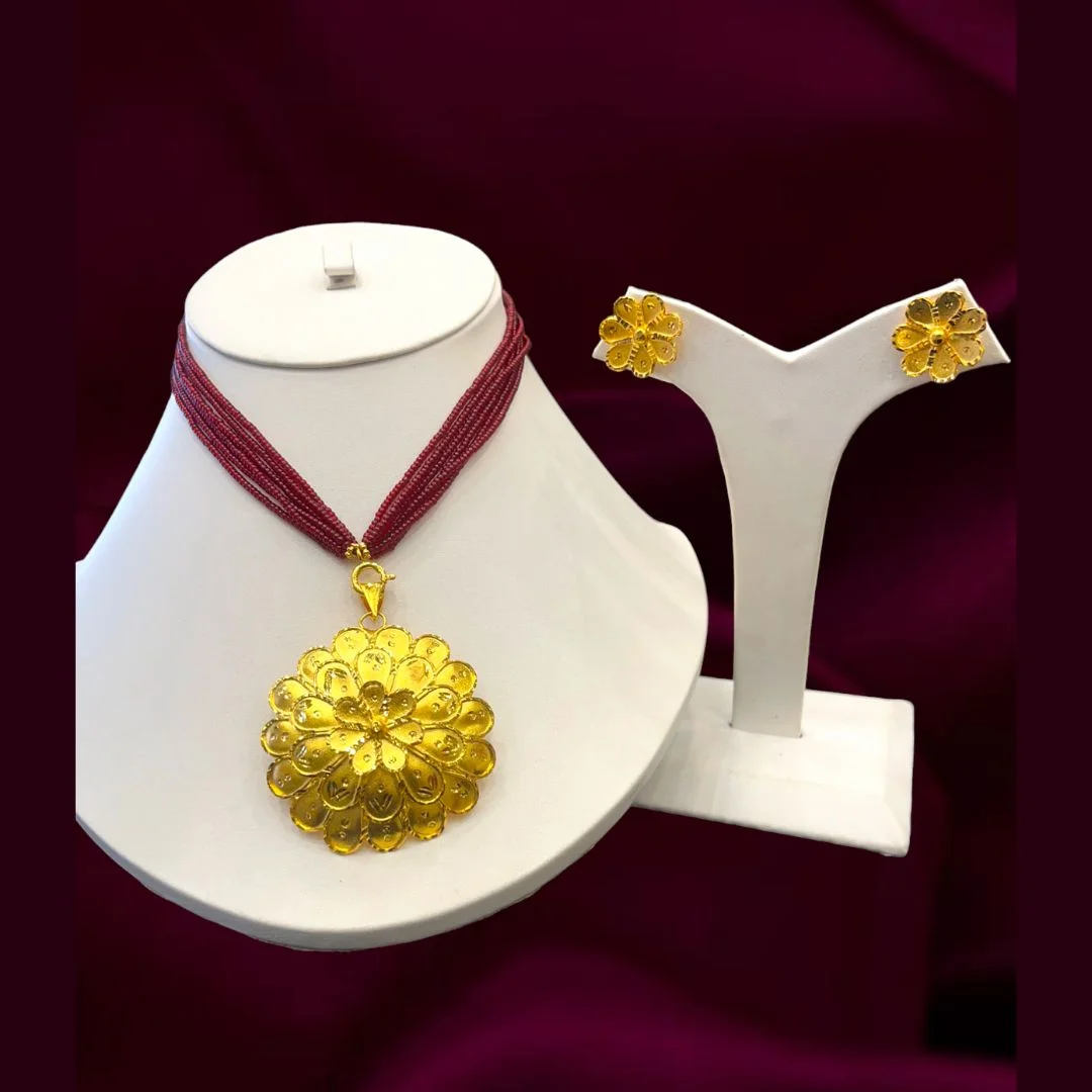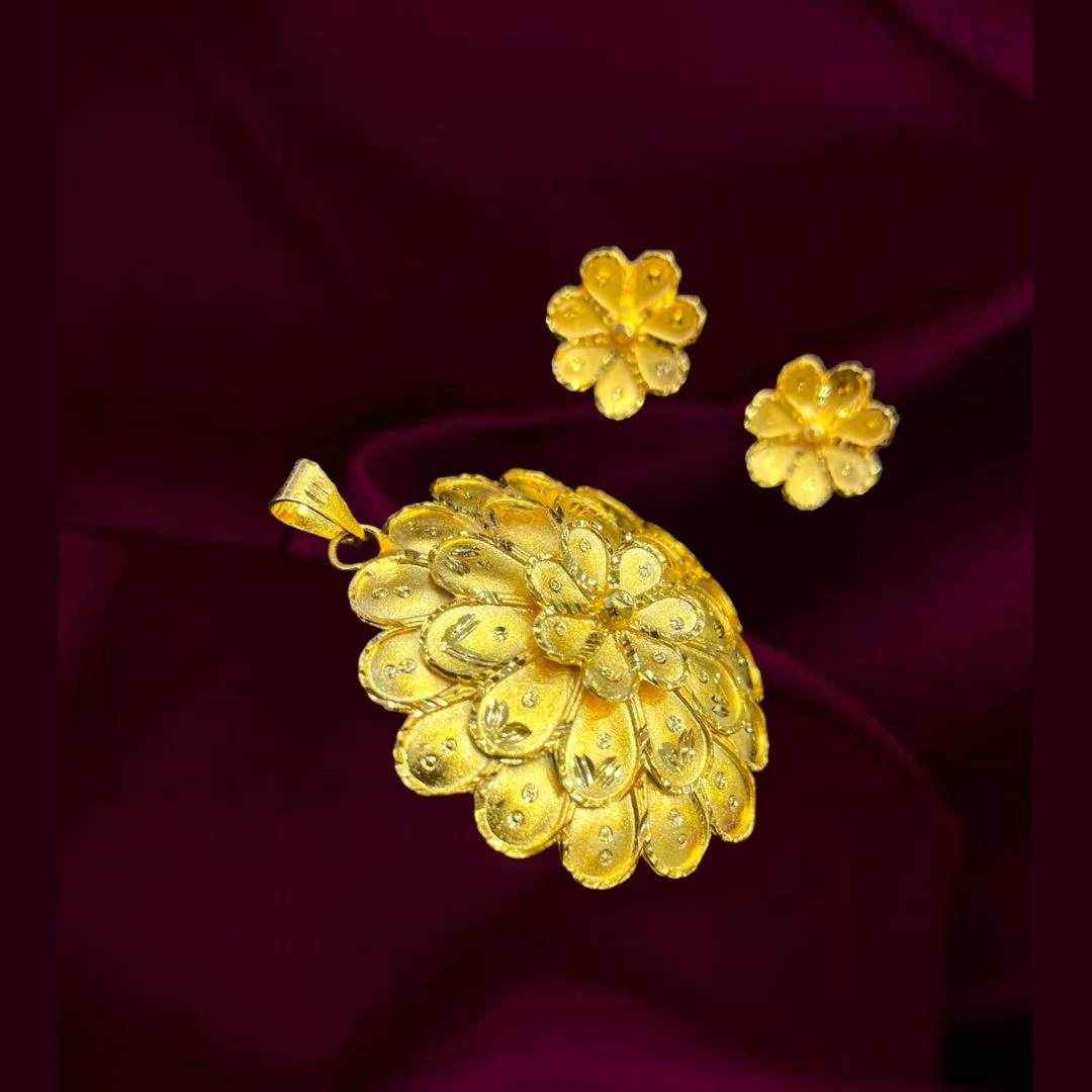 traditional floral motif diamond frosting work gold replica pendant with earrings set ( 5% off )