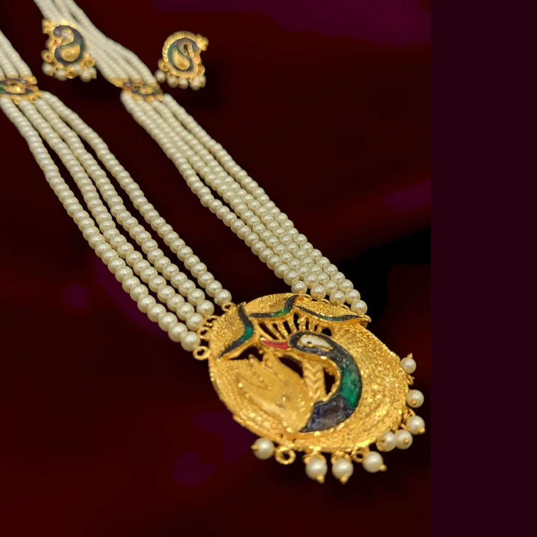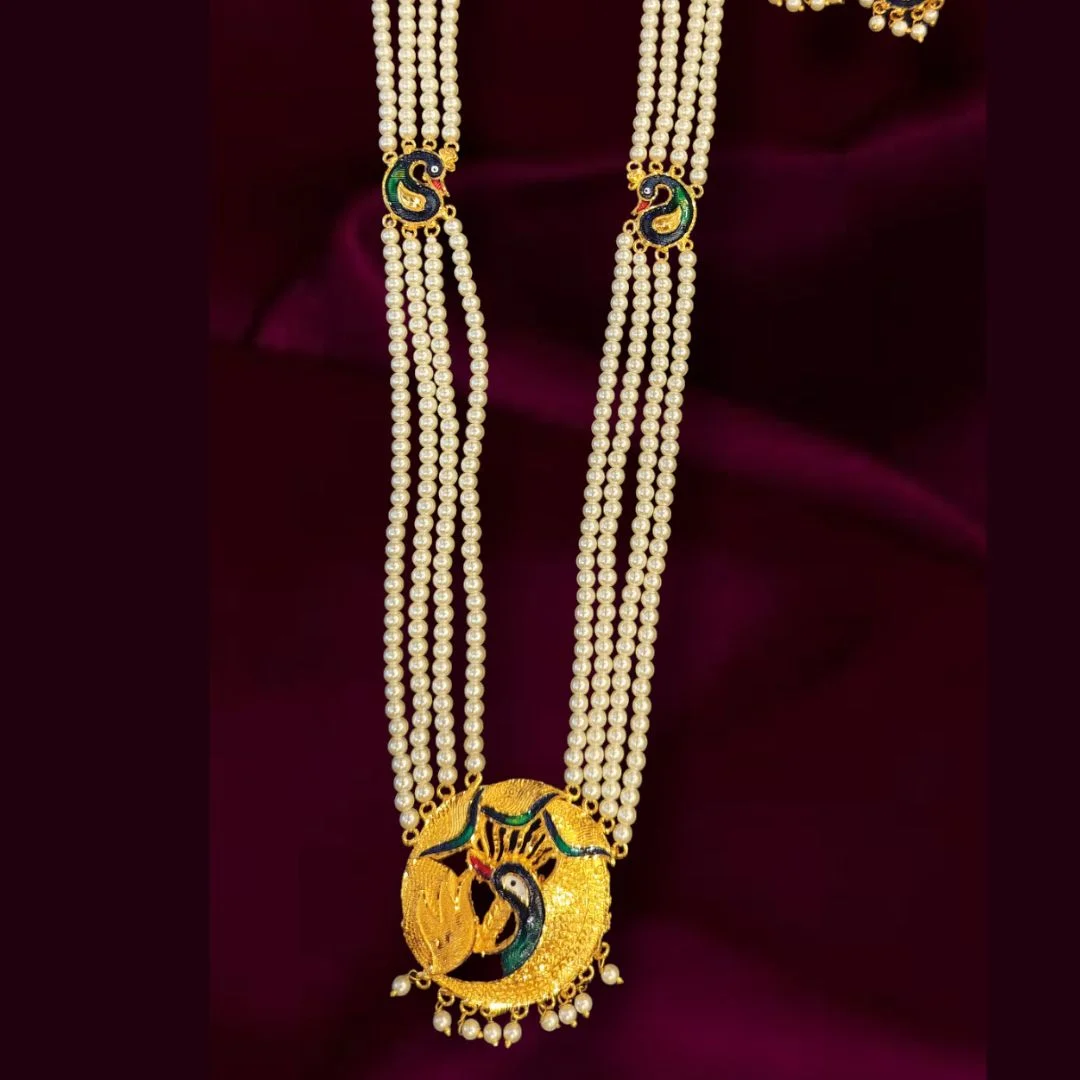 Traditional Peacock motif minakari pearl long Sita har with pearl work peacock stud